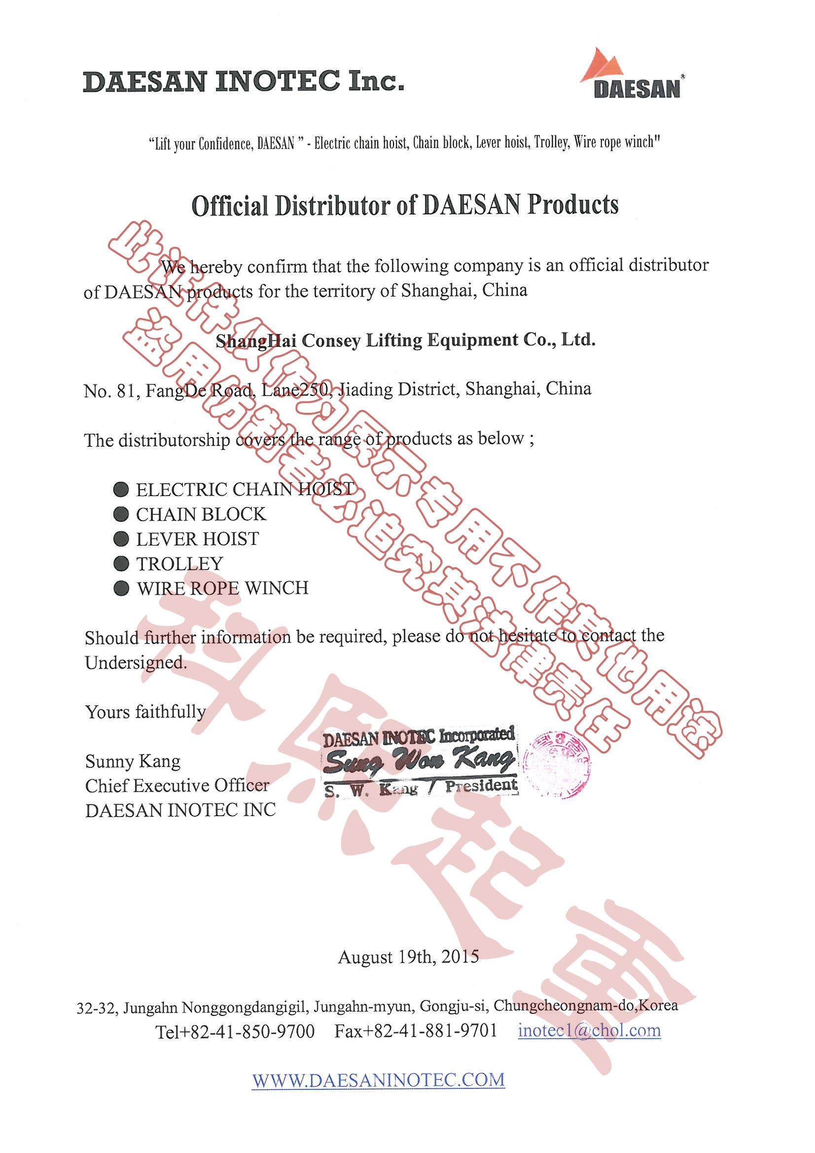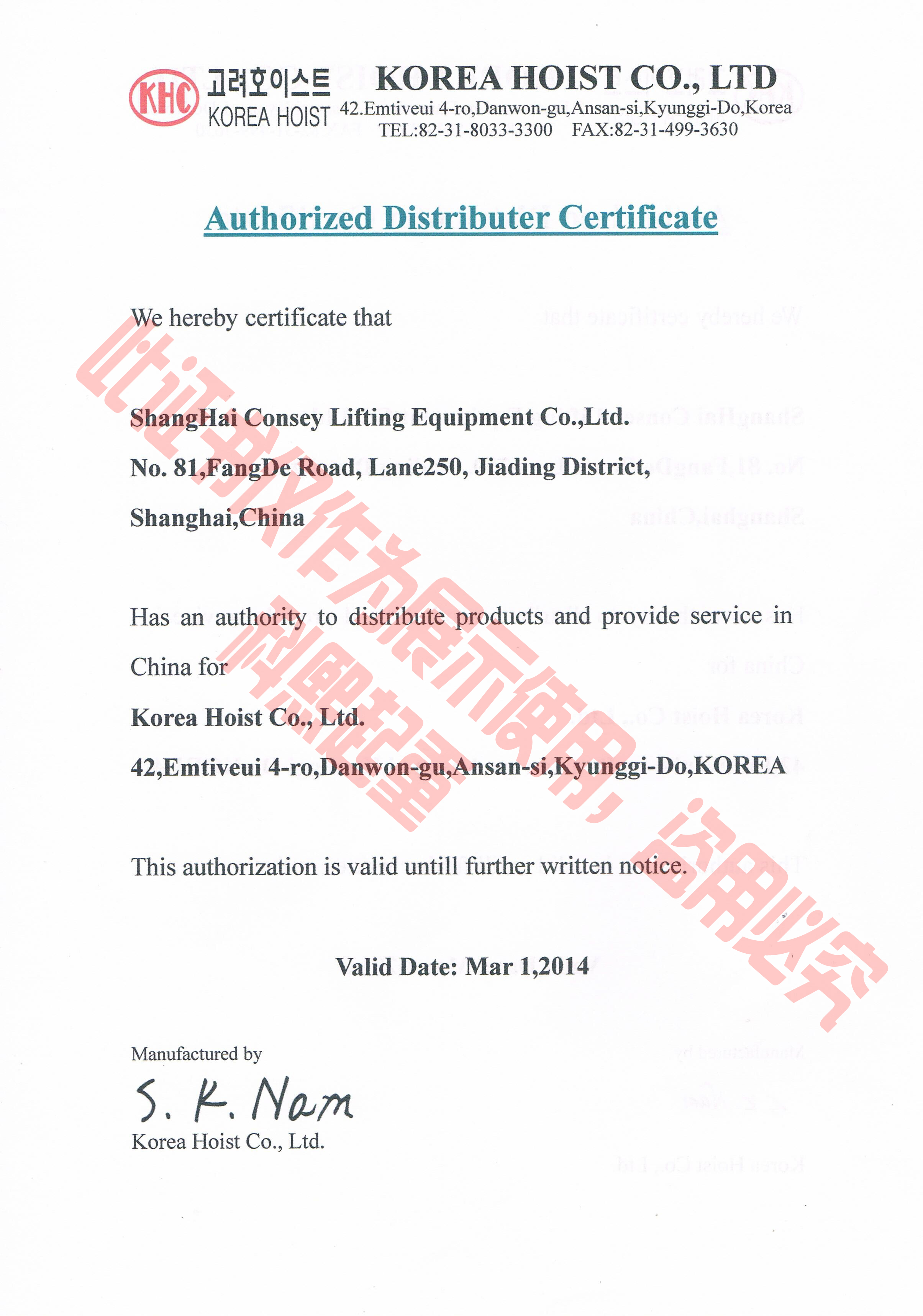 韓國KHC株式會社(氣動葫蘆代理授權書展示)