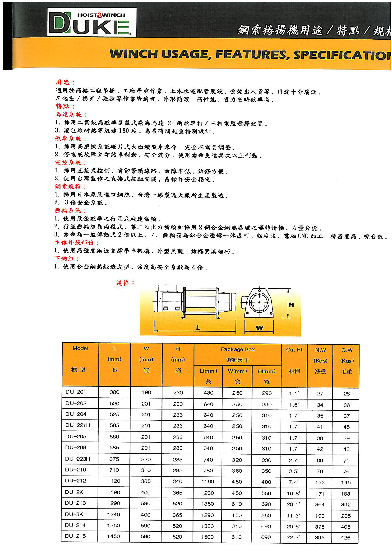 【馬達(dá)系統(tǒng)】DU-205迷你卷揚機(jī)選用工業(yè)級高效率鼠籠式感應(yīng)馬達(dá),工作效率高;