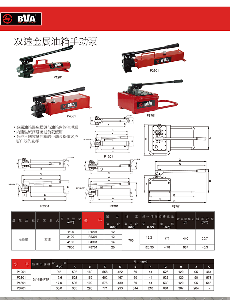 BVA泵類:SR05~SR10 BVA液壓擴張器,BVA法蘭分離器,PA1500~ PA7550 BVA金屬油箱氣動泵,PA600/PA600H BVA全方向操作式氣動泵,PA1500M BVA雙作用缸用氣泵,PA1500L/PA3801L BVA線控式氣動泵,P350~P1000 BVA雙速度鋁制手動泵,P1201~P8701 BVA雙速金屬油箱手動泵,P2301M~P8701M BVA雙作用缸手動泵,P240L BVA低壓手動泵,PEM0501C~PESM3005C BVA電動泵,PARD1701~PAR4003 BVA旋轉(zhuǎn)式泵,PG5505 BVAHONDA引擎汽油泵。