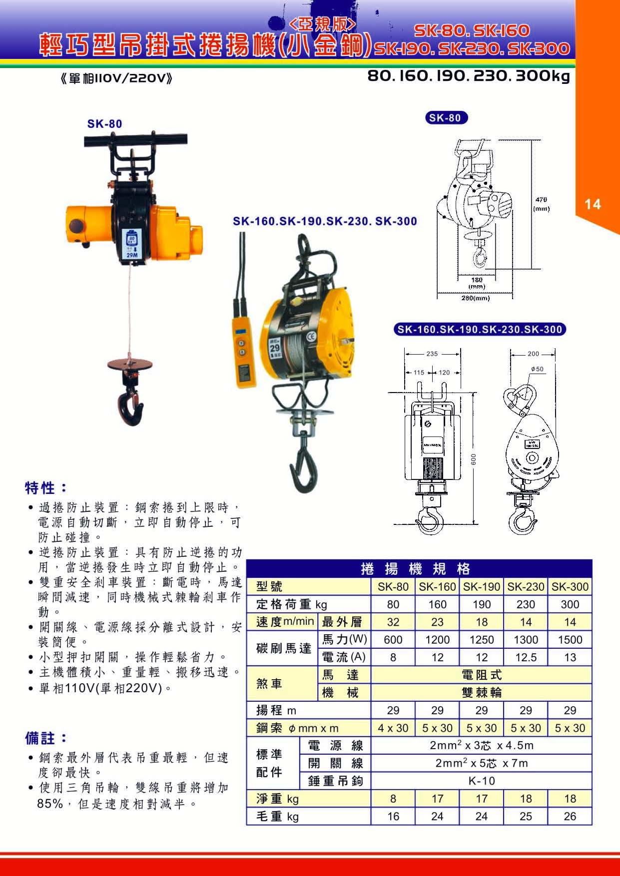 臺灣KIO輕巧型吊掛卷揚機 SK-80/160/190/230/250/300KG迷你卷揚機